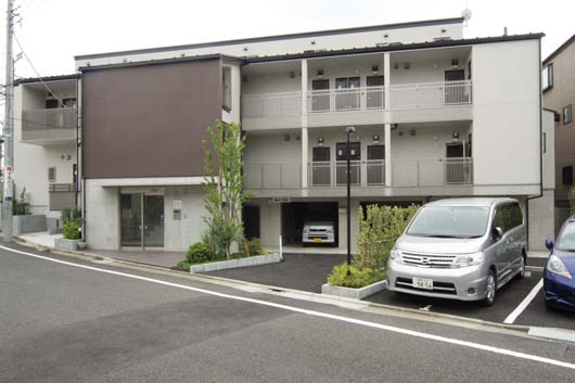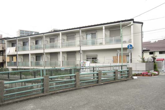 1階を事務所・駐車場とした木造3階建ての共同住宅である。計画地は東京大田区の中程を縦走する呑川に近接する三方を道路にかこまれた南北に長い異形の敷地である。敷地の東側、南側、南西側が幅員4〜7mの道路に接し、南西面道路に沿って呑川が流れる。