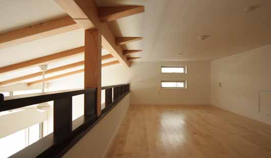 リビングとロフトをつなぐ吹き抜け空間。構造材のナチュラルカラーと造作材の焦げ茶が空間を引き締めながら、奥行き感を演出。
