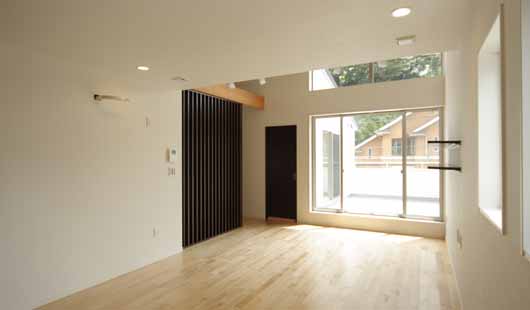 南側道路の奥行きの深い敷地を生かすため、2階にリビングと道路空間と連続するルーフテラスを配置して、広がりのある生活空間を創出。