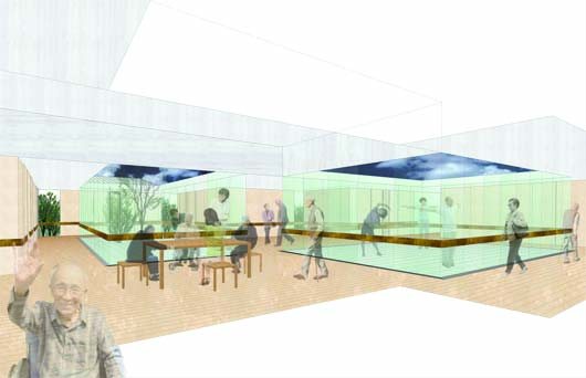 敷地は、里山の南斜面の高台に位置し、南および西側に高樹齢の木々がこの敷地の歴史を物語っている。 法規制により面積制限(500m2)がかかることと、この樹木に囲われた敷地を最大限生かすため、平屋建て案を提案した。 2つで1ユニットの住戸型の居室を、中庭を取り囲むように配置し、その間を回遊できるよう廊下でつなげることで、開放的なパブリックスペースを創り出した。 中庭は屋内的な使い方を想定し、実面積よりも広く使える勝手の良いスペースである。