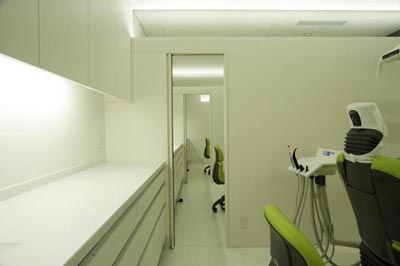 次に向かう治療を受ける診察空間はリラックスして治療を受けることができるように、爽やかな光につつまれた空間。光と素材(カラー)を変えることで、2つの空間を明快に分けた。