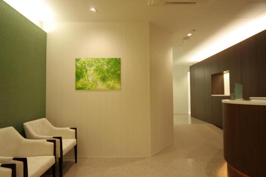 診療空間は、2つの空間に分けて計画した。公共廊下部から一歩、医院内に入った待合い空間は、これから治療を受ける患者の落ち着けるホテルロビーのような空間である。