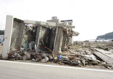 「女川」 高さ15〜20mの波は、RC建物を横倒しさせるほどの力です