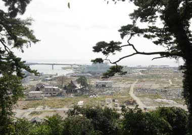 日和山公園高台からの駅側の町の眺め。建物の1階廻りがこわれています
